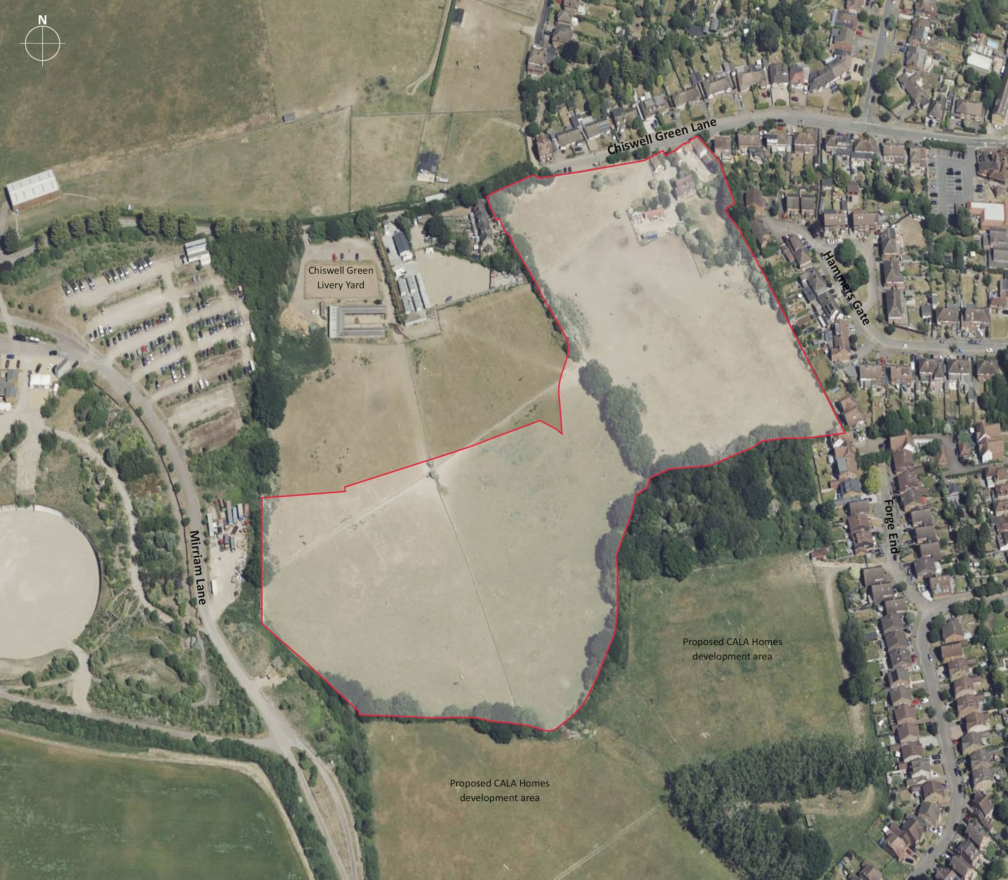 The reserved matters site area extends to 5.86 hectares. To the north of the site, and bounded by Chiswell Green Lane, are a number of existing farm buildings which will be demolished. The site slopes from north down to the southern boundary with the CALA development site.